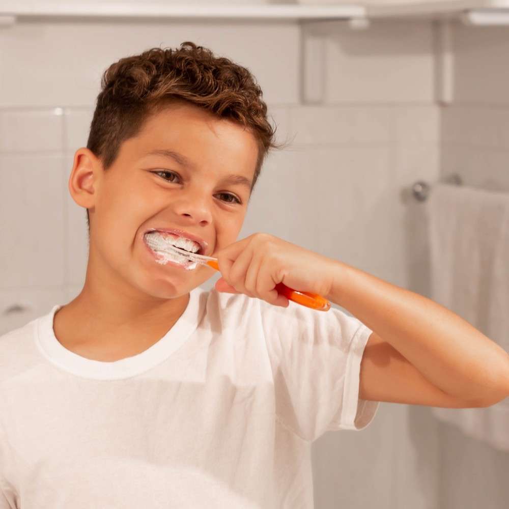 Wet bristles and apply a pea-sized amount of toothpaste.